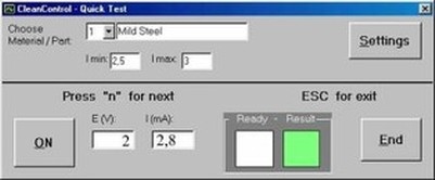 Messergebnisse außerhalb der Vorgaben werden durch eine rote Anzeige kenntlich gemacht. Kontrollvorgaben und Elektrolyt hängen von den untersuchten Teilen (Werkstoffen) ab. Der Schnelltest kann von jedem Werker nach kurzer Einarbeitung durchgeführt werden.