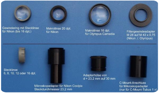 Hinweis: Auf Grund konstruktiver Gegebenheiten können nicht alle Kameras gut an ein Mikroskop adaptiert werden. Zur Vermeidung von Vignettierungen erfordern einige Kameras das Zoomen in den Digitalbereich, um ein Vollbild zu erhalten. Generell ungeeignet sind Kameras ohne Filtergewinde oder ohne “optionales Filtergewinde” (letztere erfordern zusätzlich einen Adapterring).